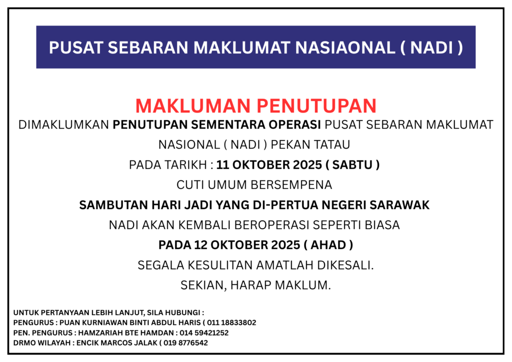 Dimaklumkan bahawa Pusat Sebaran Maklumat Nasional (NADI) PEKAN TATAU akan ditutup sementara pada 11 Oktober 2025 (Sabtu) bersempena Cuti Umum Sambutan Hari Jadi Yang Di-Pertua Negeri Sarawak. ![]()